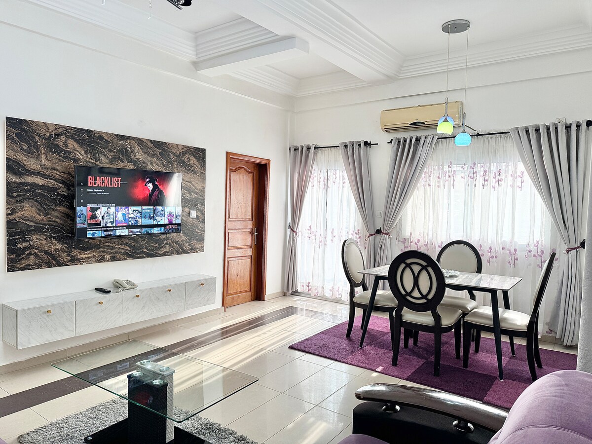 L'appartement en question dispose de plusieurs équipements confortable pour mettre à l'aise le client qui y sejournera à savoir les meubles confortable avec wifi , balcon , , chambre spacieuses suivie de la salle de bain avec begnoir , cuisine moderne , parking privé et sécurisé. L'emplacement de la résidence se trouve dans un environnement calme et donnant à la voie de la route secondaire bitumé .