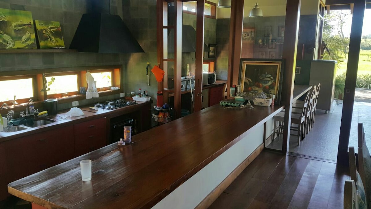 Chácara com casa ampla em Bonito - MS, as margens do Rio Mimoso. A 12km do centro de Bonito. Para 12 pessoas. Acomoda até 15 pessoas com adicional de hóspede. Com todos os utensílios de cozinha, cama e banho. O rio fica aos fundos da casa, 2 minutos caminhando.