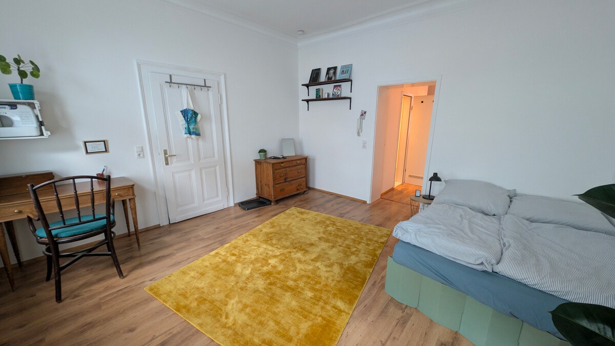 Die Wohnung besteht aus einem wohnlichen EG Zimmer und einem Schlafzimmer mit Bad im hellen Sous-Terrain, das ebenfalls ein großes Fenster enthält. Beide Räume sind durch eine innenliegende Treppe verbunden. Der Wohnraum mit hohen Decken und Stuck bietet viel Platz. Die schöne, moderne Küchenzeile mit zwei Kochplatten, Mikrowelle und Spülmaschine ermöglicht eine gute Selbstversorgung.