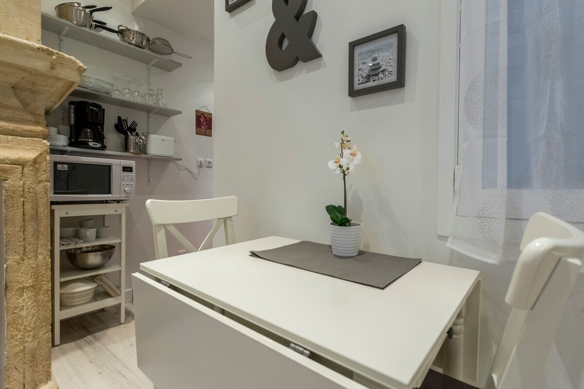 Adorável apartamento luminoso de dois quartos num edifício de pedra no coração do centro histórico. Muito bem localizado a 200 m da Place de la Bourse e do espelho d 'água, aninhado num pequeno beco entre a Place du Palais (ChezFred) e a Place Saint-Pierre. Próximo das paragens de elétrico! Linha de elétrico direta para o Aeroporto de Mérignac. Lareira de pedra acolhedora, acolhedora, típica. Decoração de design lenta com toques escandinavos. Base de cozinha orgânica. Cama muito confortável roupa de cama e lã de cordeiro.