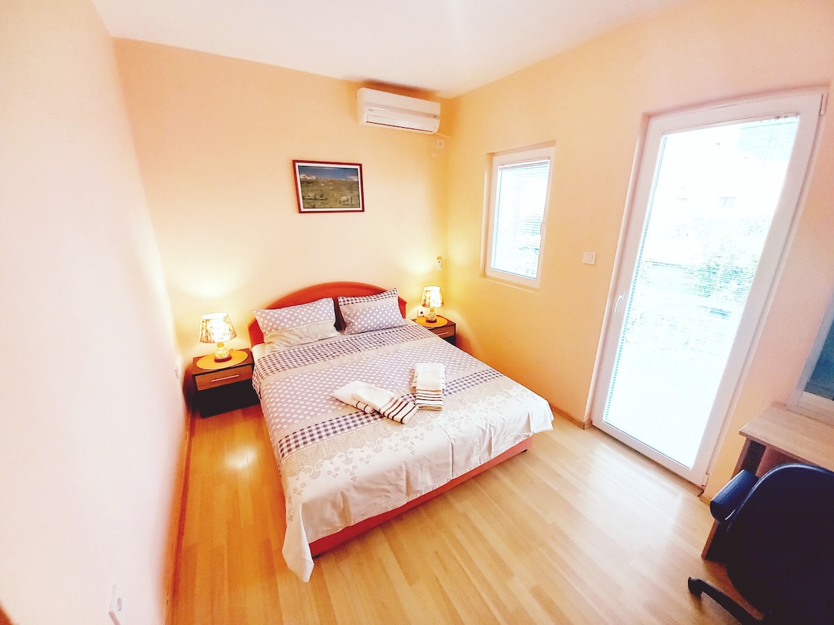 Moradia acolhedora no centro. O quarto tem 2 quartos separados e 1 cama de casal, 2 camas individuais. ✔AC/Heat casa de banho ✔privativa TV ✔LCD ✔grande terraço secador de ✔cabelo ✔ ✔frigorífico ✔ ✔cofre e chinelosshowergel ✔kitchenette. Os utensílios de cozinha serão fornecidos por nós. A 3 minutos a pé de 4 supermercados diferentes. 200 mt da famosa Praia de Slovenska, 350 mt até ao TQ Plaza, bem conhecido ponto de encontro no centro e muitos restaurantes. 1 km de Stari Grad. 500 metros da estação de autocarros. Pegue na mala e aproveite as suas férias.