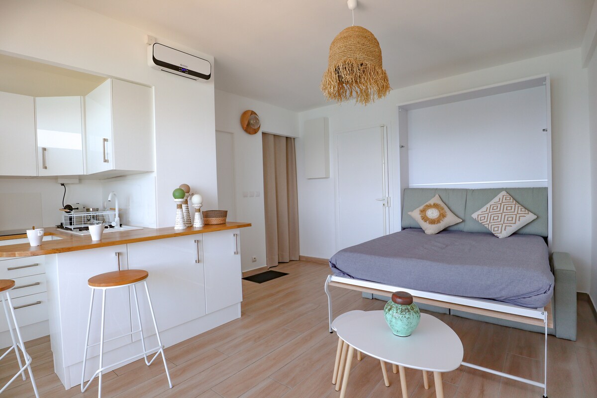 A dois passos do mar e de todos os locais de conveniência... Estúdio confortavelmente mobiliado, tranquilo, ideal para 2-3 pessoas: - Estacionamento privativo gratuito e seguro - Sofá-cama de 160*210 + cama de solteiro - Cozinha equipada - Áreas de jantar interna e externa - Terraço com vista - Banheiro equipado - Banheiro separado - Berço e cadeira alta disponíveis mediante solicitação A roupa de cama é fornecida no local. Traga toalhas de banho.