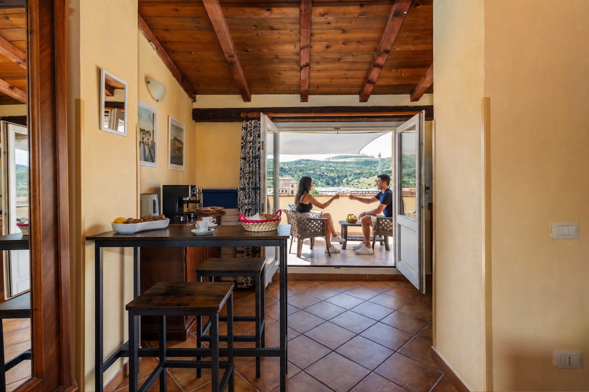 This cosy studio apartment is on the first floor of a charming town-house in the medieval 'Centro Storico' of Bosa, on the west coast of Sardinia. It's centrally located, conveniently close to bars, restaurants, shops, pretty riverside walks and Bosa Marina with its award-winning beach. The apartment is finished to a high standard, featuring a captivating arched ceiling in the period style. It has a modern ensuite bathroom, a cute kitchenette and a balcony overlooking the cobbled high street.