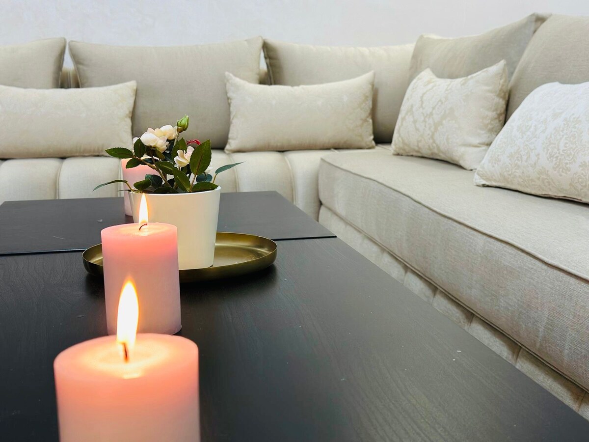 Amusez-vous avec toute la famille dans ce logement chic. Appartement dans une résidence sécurisée et fermée, proche de l aéroport et les plages de Tanger... Un spacieux Salon avec fauteuils de qualité, une smart TV de 50 pouces. une Chambre parentale avec dressing, 2eme chambre avec deux lits séparés et l ensemble avec matelas médicaux Simons. une cuisine bien équipée, tout électrique avec 0 équipement en Gaz pour votre sécurité. une spacieuse douche avec un chauffe eau électrique Junkers.