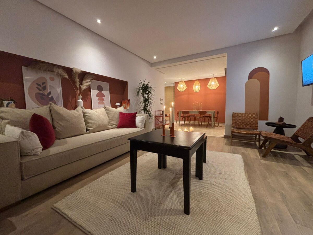 Retiro ✨ elegante no coração de Casablanca, mesmo em frente à estação ferroviária Casa Port. Este apartamento luminoso e espaçoso de 83 m² oferece todo o conforto de que precisa para uma estadia perfeita e pode acomodar confortavelmente até 5 hóspedes. Tem 2 quartos tranquilos com vista para o jardim, uma sala de estar em estilo de cinema em casa (televisão de 75 polegadas), uma varanda com vista para a Mesquita Hassan II, uma cozinha totalmente equipada e um espaço de trabalho dedicado. Perfeito para momentos de descontração, seja para um fim de semana ou uma estadia prolongada 🌇🌿