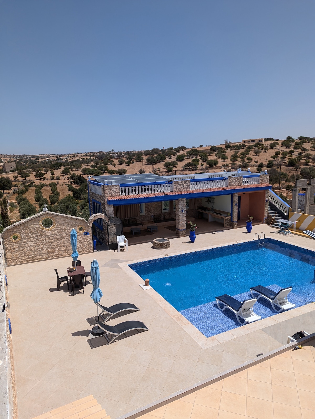 Charming Family Villa, 2levels, independent, spacious, well illuminated, a big private pool of 75m² and a beautiful garden. Located on the countryside, 16km from Essaouira on Sidi Kaouki rd, it has a luxurious finish, chimney, open fire place in the garden, olive and fruit trees and two beautiful Terraces with pergolas. Modern and peaceful. Airport at 6.5km and shops and a supermarket at 10min. You will need a vehicle to get around.