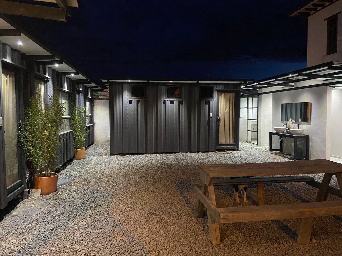 Conecte-se com a natureza nesta escapadela inesquecível. Desfrute de um contentor espaçoso e moderno com 2 quartos, cozinha equipada, casa de banho privativa, sala de estar acolhedora e área de churrasco. Rodeado por áreas verdes, com Wi-Fi, estacionamento coberto para 5 veículos e apenas a 700 metros da praça principal de Villa de Leyva. Ideal para famílias, amigos ou casais que procuram descanso, estilo e conforto num ambiente exclusivo.