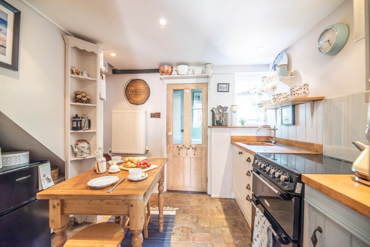 Queenies Cottage foi lindamente restaurado para manter muitas características arquitetônicas originais, enquanto proporciona confortos modernos; aquecimento sob o piso, fogão a lenha, cozinha equipada, banheiro molhado no andar de baixo e um banheiro privativo no quarto principal. Situado bem atrás da estrada, o jardim privado virado para o sul tem um espaço de jantar coberto adicional, ótimo em todas as estações. Excelente banda larga rápida ilimitada. cães são bem-vindos Queenies é um espaço encantador e generoso para 2 hóspedes com um jardim seguro.