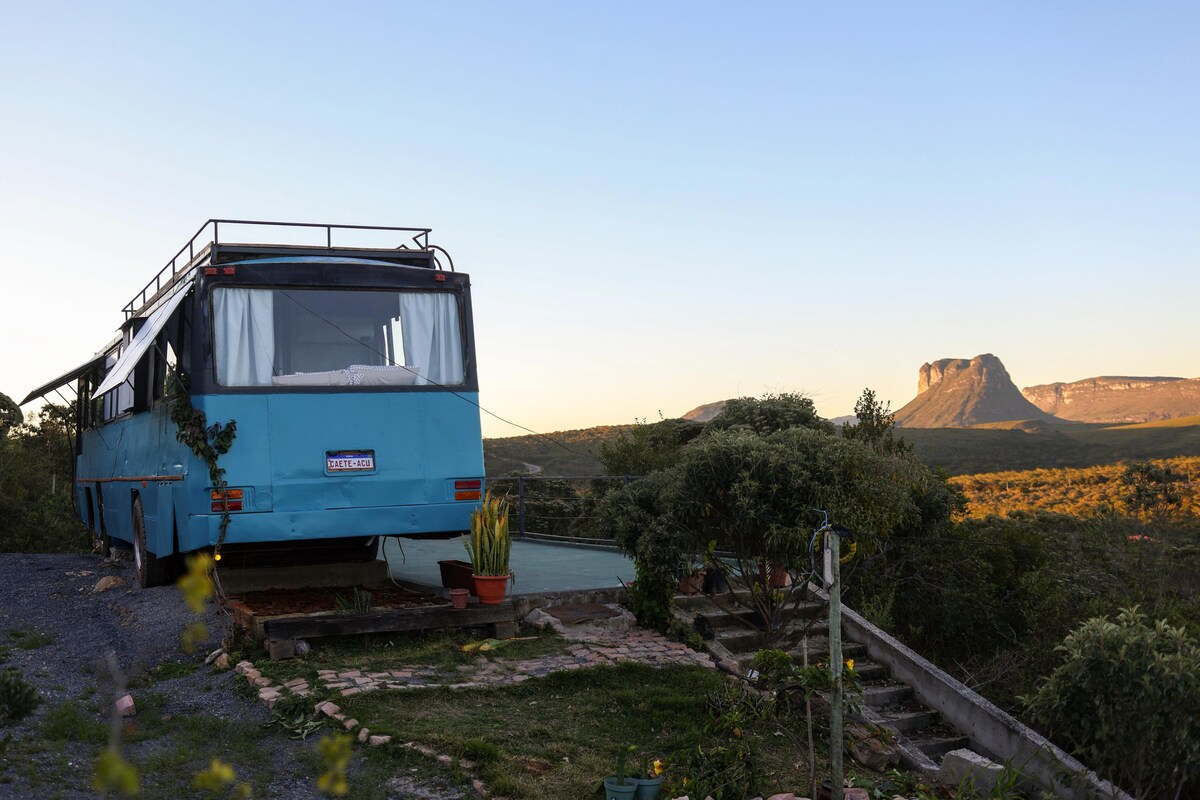 Fuja do óbvio sem abrir mão do conforto: hospede-se em um Marcopolo Torino 1986 convertido artesanalmente em um charmoso chalé sobre rodas. Com revestimento termoacústico, oferece cama de casal, ar condicionado, banheiro interno com chuveiro quente, cozinha com adega, TV, internet e sala com sofá-cama. Do lado de fora, varanda ampla com a melhor vista do Vale do Capão, acesso fácil e garagem.