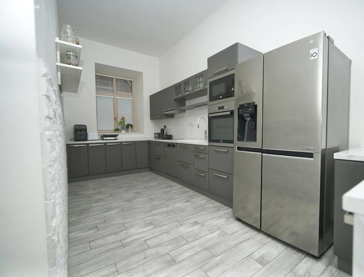 Apartamento recém-construído 2+kk em uma parte tranquila da cidade com terraço, Wi-Fi, estacionamento e bicicletário com chave. A acomodação está localizada a apenas 20 minutos a pé do centro da cidade. Capacidade máxima 4 pessoas. No piso térreo do apartamento há uma cozinha equipada com geladeira, fogão de indução, cafeteira e máquina de lavar louça. No andar de cima há uma sala de estar com sofá-cama e um quarto com cama de casal com acesso ao terraço. Perto do apartamento há uma ciclovia (60m), supermercado (300m), piscina (350m) e estação de trem (700m).