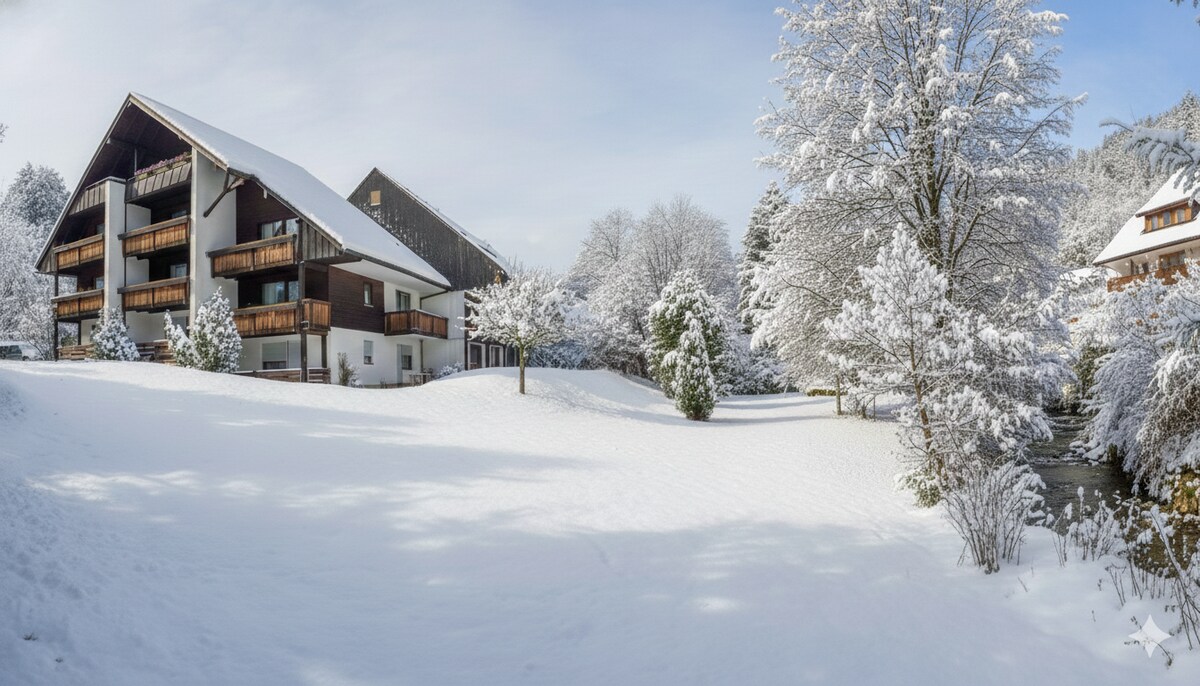 Taxa adicional a ser paga em dinheiro à chegada: Imposto de Turismo Obrigatório de 3 euros p.p./noite e 1,60 euros p. criança/noite (6 a 15 anos)! Bem-vindo ao nosso apartamento super aconchegante no coração da floresta negra! Estamos a 300m do lago, perto de trilhos de caminhada premium e a apenas 800 m da estação de comboio - para viagens gratuitas por toda a região da floresta negra devido ao "KONUS-Karte" gratuito. Estamos a apenas 15 minutos da Feldberg Ski Arena/Reserva Natural e a 5 minutos (de carro) das pistas de esqui/pistas de cross-country.