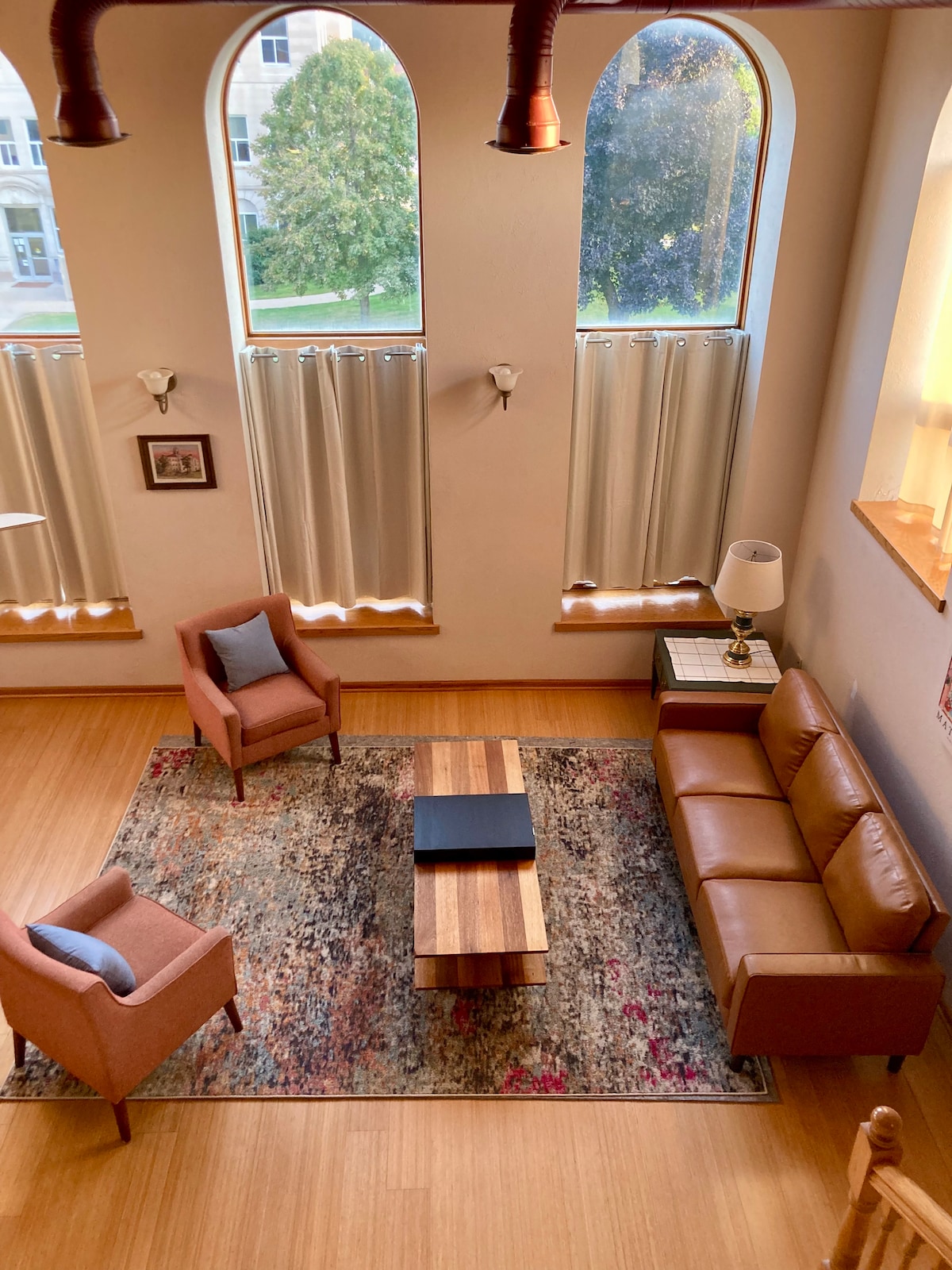 This loft is situated above a small town bustling coffee shop, also overlooking the park in the town square. The space is the perfect combination of old historic charm with a modern urban flair with plenty of natural sunlight streaming through the front windows. The kitchen flows seamlessly into the living room where there are multiple seating options. The bedroom and living room have smart TVs if you want to use your own streaming site. The spa inspired bathroom has numerous amenities included.