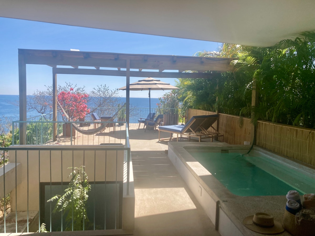 Bonita suíte de 2 quartos com piscina e terraço privativo com rede e vista para o mar - acima da praia de Coral, cozinha totalmente equipada e sala de estar aconchegante. Ótimo para trabalhadores remotos - WIFI de fibra óptica rápida, com linha própria dedicada e modem para o apartamento. Perto de Coral Beach (ótimo para nadar e mergulhar com snorkel), Bacocho Beach (pôr do sol deslumbrante) e a famosa praia de Carrizalillo, assim como a faixa de Rinconada com muitos restaurantes, cafés, lojas de saúde, lojas convenientes e boutiques.