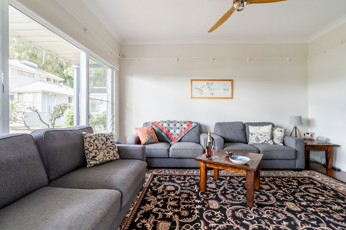 Situado ao lado da colina, com vista de 180 graus para as montanhas e cercado por belos jardins está o Eagles Nest - uma unidade de um quarto independente com cozinha totalmente equipada, banheiro, área de jantar e estar, deck externo e apenas uma curta caminhada até Forresters Beach. Está totalmente equipado para lhe fornecer uma pausa confortável e relaxada com uma cesta de café da manhã inicial fornecida e máquina de café barista.