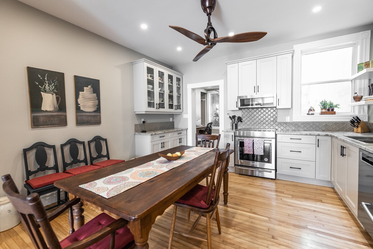 Desfrute de um apartamento de 2 pisos no bairro histórico de Brockville (a 3 quarteirões do Centennial Park e do rio). Cozinha e pavimento novos em todo o espaço em 2020. Lareira a gás para aquecimento. O sofá da sala de estar converte-se numa cama queen. TV de parede na sala de estar. As escadas são curtas, mas bastante íngremes! Quarto no loft com TV e casa de banho com pequena banheira de pés de garra. O chuveiro está na banheira e é difícil para as pessoas altas! Cama queen, cómoda e aparador com toalhas/roupa de cama. Estacionamento privado e gratuito numa viela em frente. Deck frontal com mesa e cadeiras. Unidades de ar condicionado de janela.