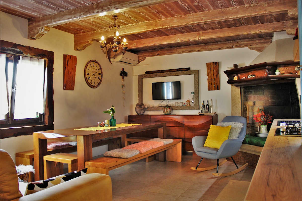 A casa foi projetada principalmente para o desfrute da família e para receber amigos com lareira, boa comida, vinho e fogueira. É por isso que tem uma mesa e bancos grandes. Nós a decoramos ao nosso gosto, todos os móveis são feitos de madeira. Ao decorá-la, não nos guiamos pelo fato de que tudo deve ser harmonizado e adequado, mas pelo fato de que deve ser bonito, confortável e funcional para nós. Como, com o tempo, tivemos a ideia de alugar, esperamos que todos os hóspedes que se encontrarem nela também se sintam bem e confortáveis.