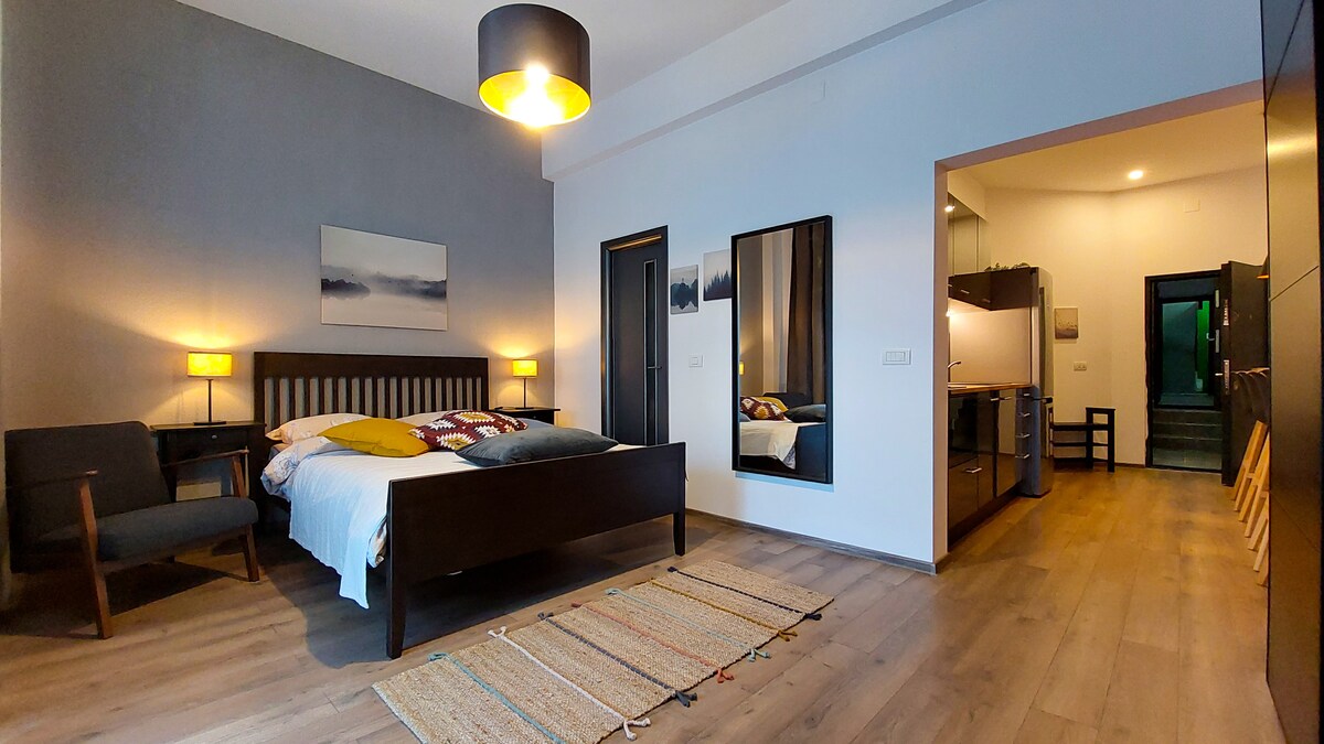 Studio modern si complet utilat, situat intr-o cladire monument din Cartierul Evreiesc, care încă păstrează urmele vieții de altă dată. Este poziționat in centrul capitalei, la 9 minute de mers pe jos la universitate, fiind ușor de ajuns oriunde în oraș. De asemenea, locația dispune in imediata apropiere de multe magazine alimentare, farmacii si spitale, iar accesul la căile de transport in comun se face chiar din fata casei. Este locul ideal pentru a-ți planifica un sejur in capitală!