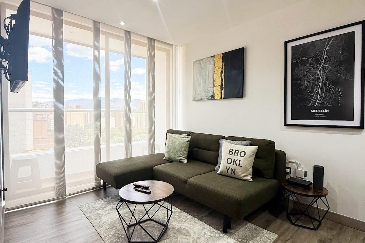 RENOVADA RECENTEMENTE -Internet de alta velocidade ótima para trabalho remoto - Novo ar condicionado da marca - Apartamento de design industrial totalmente renovado - Cama king size - Vistas deslumbrantes de Medellín (confie em mim, vale a pena ficar aqui) -19º andar - Localização imbatível em Poblado perto de Provenza e Lleras Park - Comodidades modernas - Área de estar espaçosa - Smart TV x 2 - Cozinha totalmente equipada - Torre de máquina de lavar e secar. - Piscina - Ginásio - Estacionamento - Restaurante dentro do edifício - Estacionamento privado - Check-in autónomo. -Segurança 24 horas por dia, 7 dias por