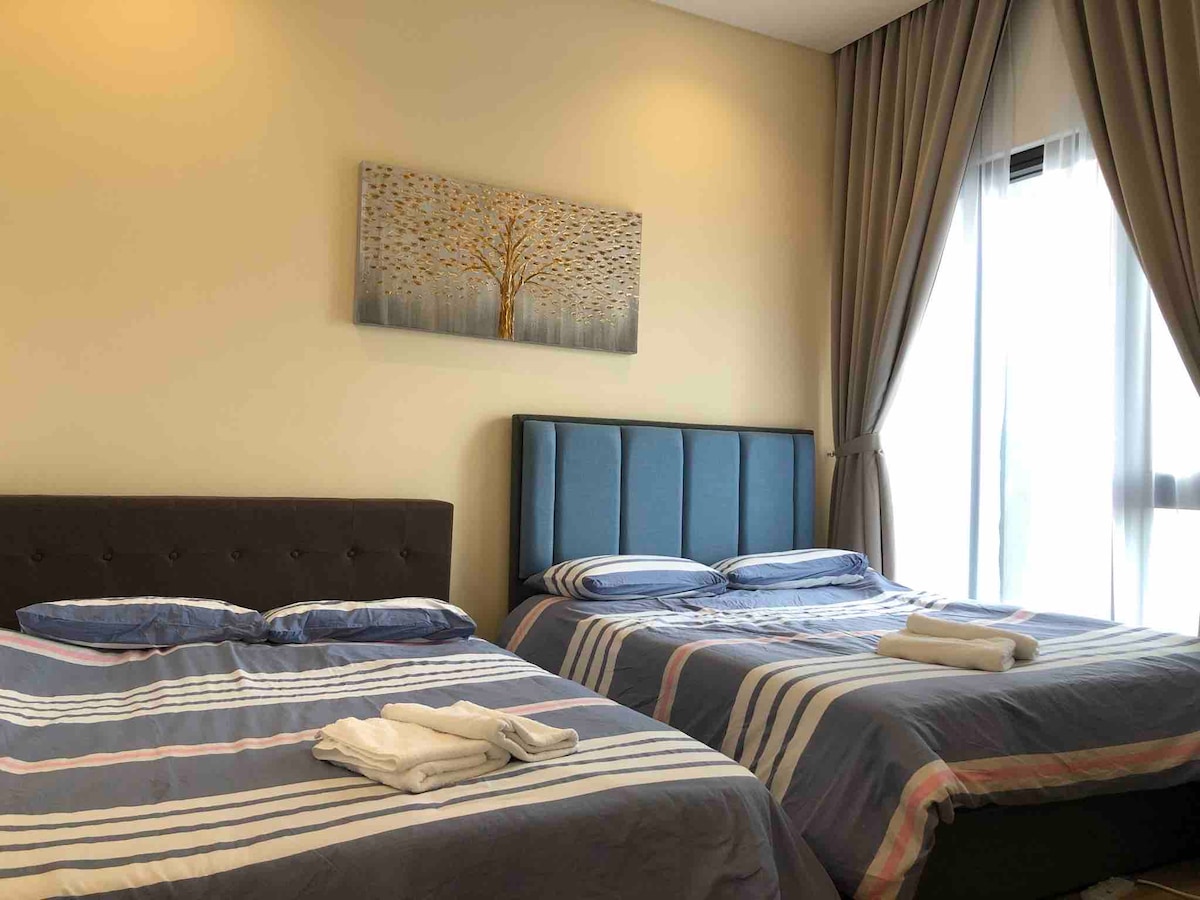 Apartamento moderno de 3 quartos recém-reformado de 1800 pés quadrados no coração do distrito comercial de KL. Diretamente em frente ao Pavilion Mall. Bom custo-benefício e perfeito para a família com orçamento. Quarto principal: 1 cama tamanho king, 1 sofá-cama tamanho queen (opcional) com banheiro privativo anexo 2º BR: 1 cama King, 1 cama de solteiro (opcional) com banheiro privativo anexo 3º BR: 1 Queen O 3º banheiro é um banheiro comum. Os hóspedes terão acesso ao KLCC, B.Bintang, Jalan Alor, tudo a 10 minutos a pé. Estacionamento gratuito disponível.