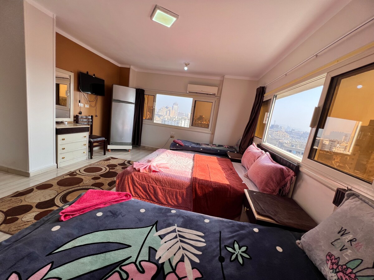 Uma estadia luxuosa no coração da cidade, perto de tudo Um quarto elegante com uma vista atraente sobre a cidade Localização ideal para os amantes da vida urbana. Está localizado perto da Praça Tahrir, da Praça Talaat Harb e da Corniche do Nilo, e fica a meia hora do aeroporto e a 5 minutos da Mesquita Al-Hussein e de Khan Al-Khalili.