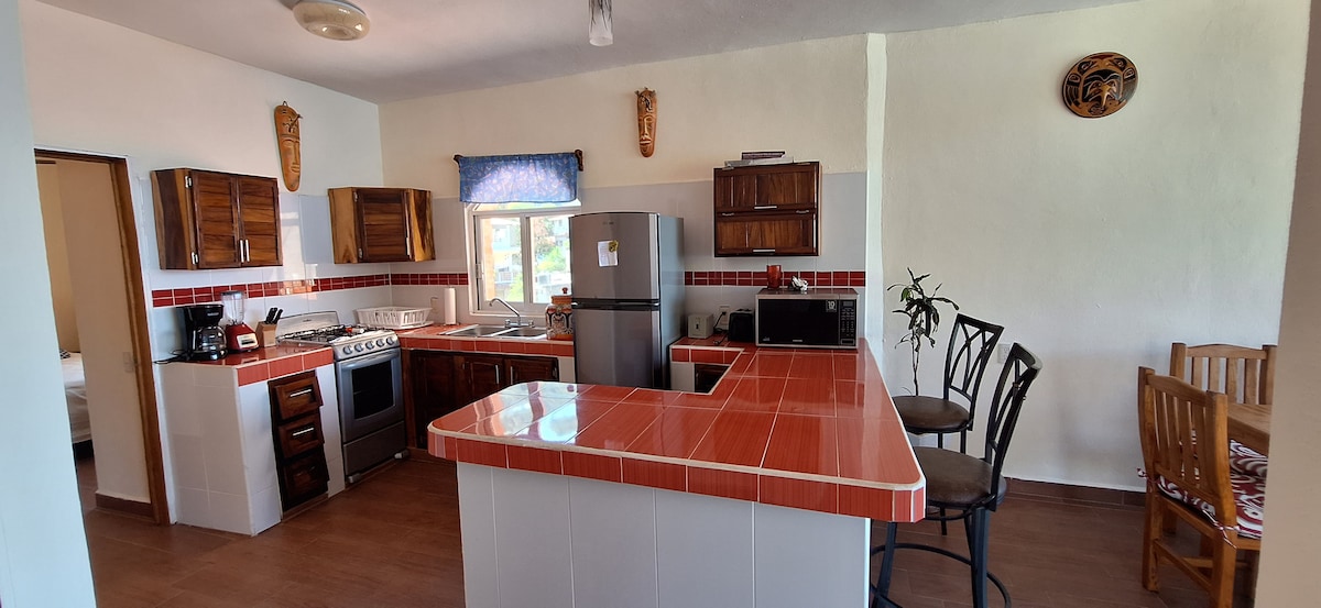 This beautiful apartment is centrally locatedin downtown. You can enjoy the best views of town and overlooking the water in Yelapa with air conditioned. The location is close to the restaurants, grocery stores, 7 minutes from the waterfall, beach inmediately below. The main space of the open floor plan over looks the bay of Yelapa, where you can relax in the hammocke and enjoy the breeze of the ocean. The kitchen comes with a refrigerator, gas range, microwave, coffee maker and cookware.