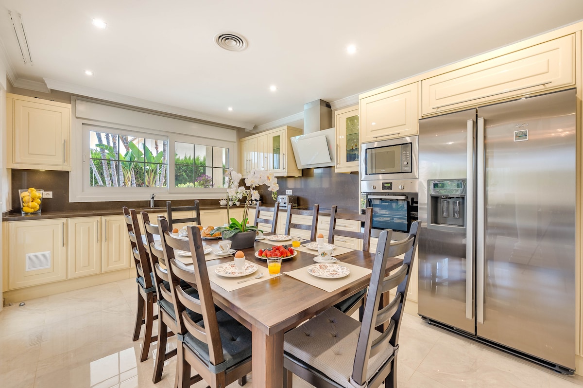 Welcome to our stunning vacation home in the enchanting Spanish village of Cabopino, Marbella. Enjoy a luxurious stay with 4 bedrooms, a stylish living room, new kitchen, and 3 bathrooms. Unwind in the front garden, backyard, or spacious rooftop terrace. There's even an office with four deluxe workstations in the basement. Within walking distance of the golf course, harbor, and beach of Cabopino. Book now and turn your dream vacation into a reality!