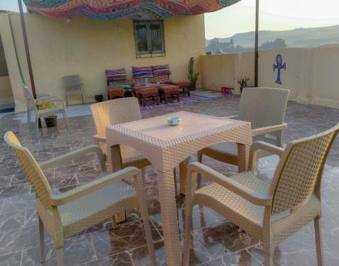 Quarto duplo grande com uma varanda privada com vista para as Pirâmides (4º andar). O quarto inclui ar condicionado, televisão, frigorífico, chaleira, bem como café, chá e água gratuitos (ferro de engomar gratuito, mediante pedido). A casa de banho inclui toalhas, um secador de cabelo e champô, sabonete e gel de banho gratuitos. O preço inclui pequeno-almoço egípcio caseiro preparado diariamente e servido no terraço das 8h às 10h.