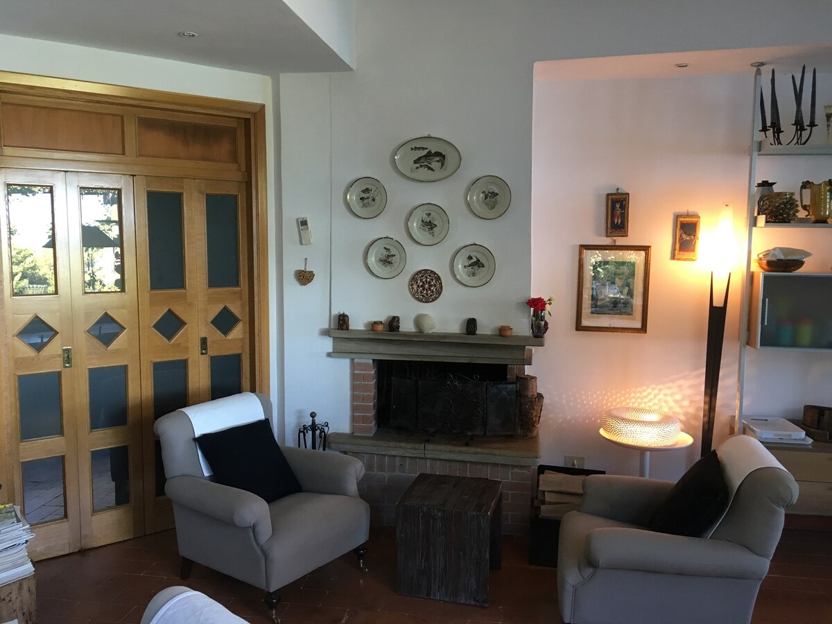 No interior da Maremma, piscina panorâmica privativa, com 360°!!! Vista do Argentario, da ilha de Giglio e da vila medieval. Pôr do sol espetacular para admirar! A vila está em um andar, caracterizada por vigas de madeira expostas, varandas, pisos de terracota feitos à mão, móveis minimalistas elegantes. Podem ficar alojadas até 6 pessoas. Parque de 2 hectares de jardim com olival e carvalhos centenários. Localizado a 5 minutos da bela vila de Pereta.