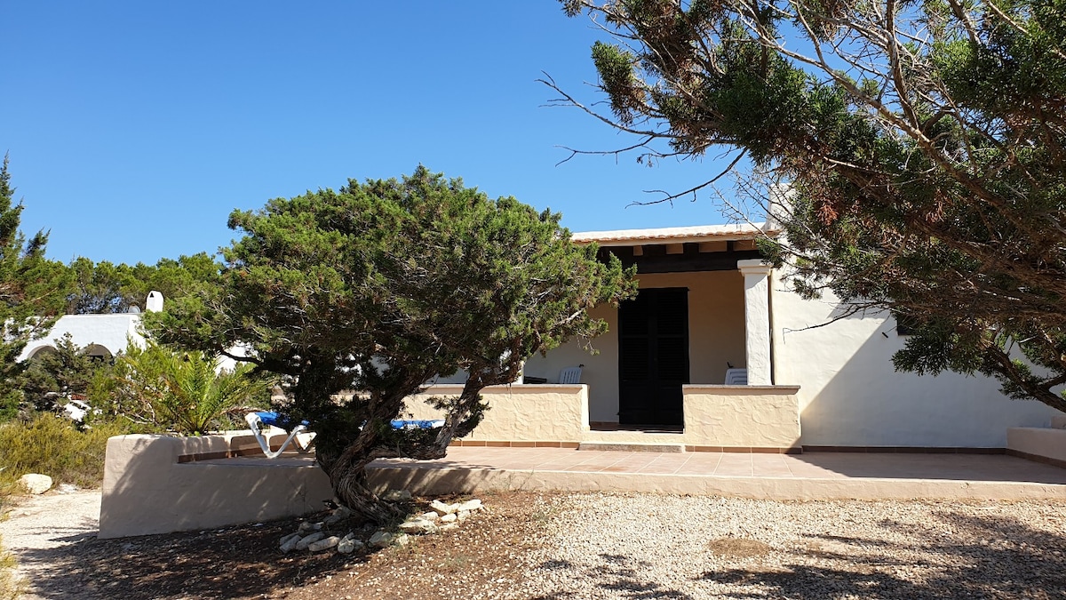 House 140m2, garden 1100m2,peaceful,2 bedrooms (double and two single beds), kitchen&bathroom fully equipped. Huge terraza. Studio annexed single bed &complete bathroom,Community swimming pool, Pines trees. Spectacular views to Talamanca Beach&Ibiza. No parties please.