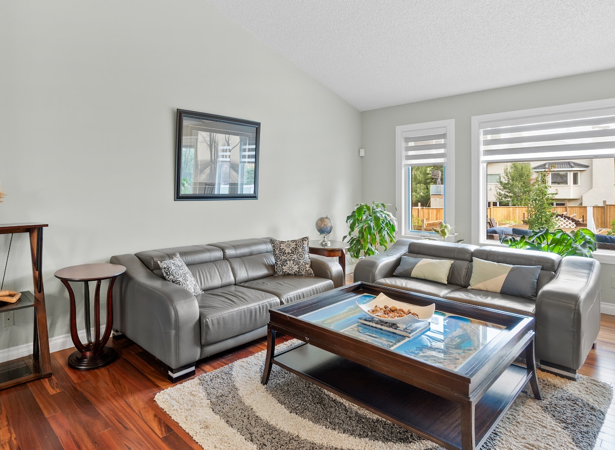Bem-vindo à bela e espaçosa Ravine Retreat House: - Mais de 4000 pés quadrados, caminhada até uma ravina deslumbrante, vista para a montanha - Entretenimento com mesa de bilhar - Estacionamento gratuito, artigos de banho e cozinha gratuitos, Wi-Fi gratuito - Cozinha totalmente abastecida; churrasqueira na varanda. - Costco, supermercados nas proximidades. - Centro da cidade, aeroporto YYC a 15 minutos - Acesso rápido a Banff. - 6 quartos 3,5 casas de banho, - 10 camas: 7 individuais +2 queen+1 king - A/C - Animais de estimação (taxa aplicada) - Perfeito para várias famílias, no máximo 5 carros ou 15 pessoas em qualquer altura.