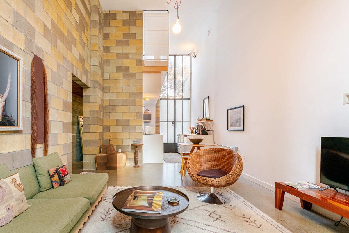 Loft histórico em Angel City: vista para o centro e design retrô urbano