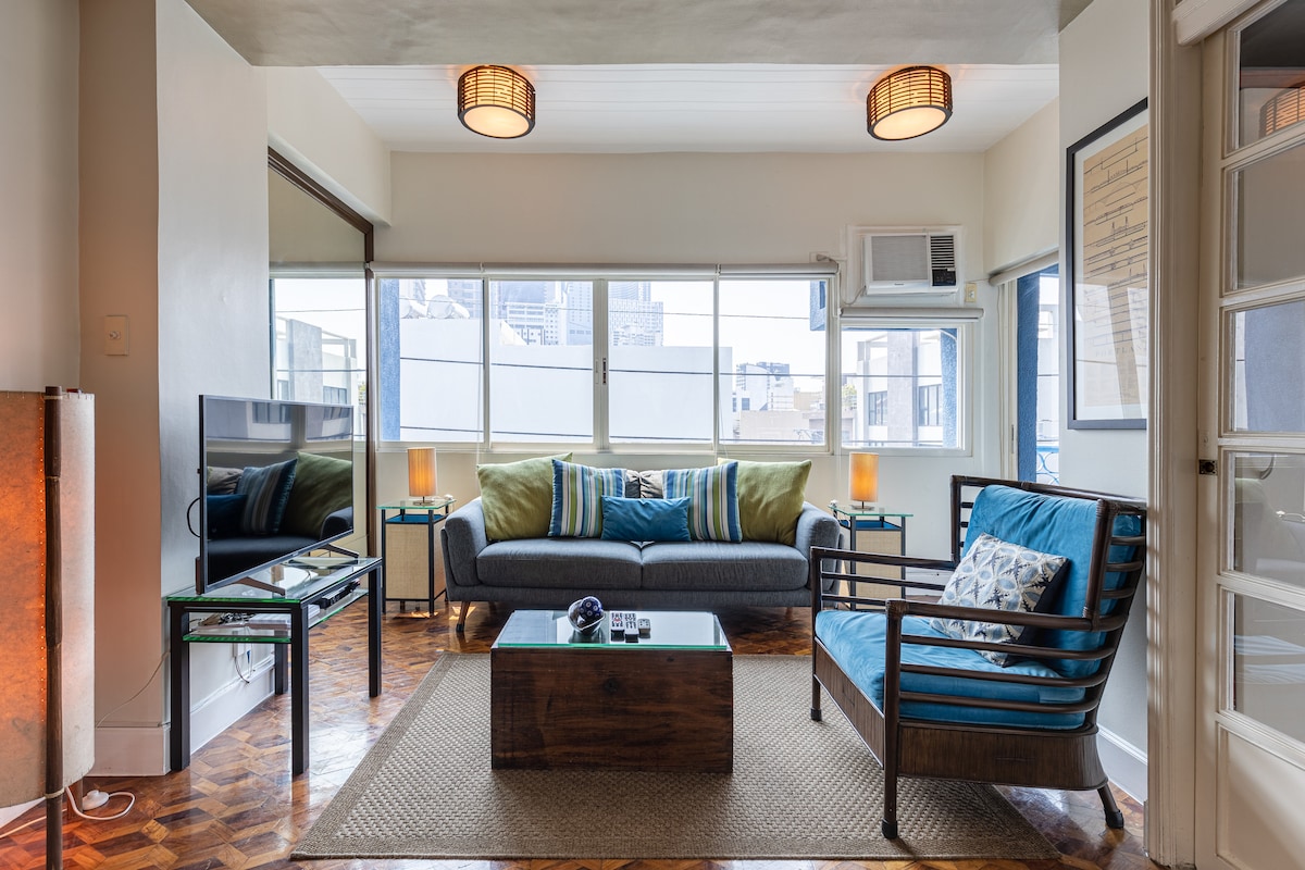 Localizado no centro do bairro de luz vermelha de Makati, este apartamento de um quarto foi renovado e equipado para se adequar a uma atmosfera de férias de verão sem fim Há 2 televisões de ecrã plano, ar condicionado tipo split no quarto, cama queen confortável, sofá elétrico reclinável, coluna de karaoke nova, cozinha e uma varanda espaçosa para fumadores 🚬 Os hóspedes registados estão autorizados a receber visitas, mas as provisões do quarto podem acomodar de 2 a 5 pessoas que pernoitem. Se preferir silêncio absoluto, este pode NÃO ser o espaço ideal para si!