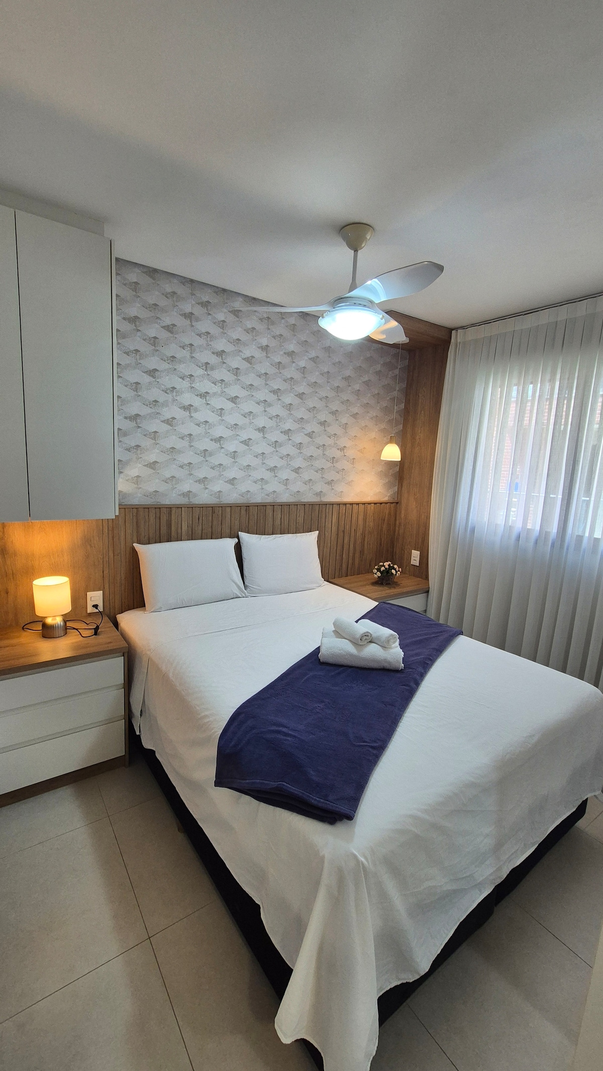 1 quarto cama queen + ar condicionado 1 quarto cama queen + ar condicionado 1 banheiro + secador cabelo 1 sala com TV, Wi-fi 500m e ar condicionado Cozinha completa e bem equipada Área de serviço com varal e máquina de lavar roupas 2 vagas de garagem Roupas de cama e banho Condomínio seguro portaria 24h Piscina adulto e infantil academia, mercado, sala de jogos, salão de festas, quiosques, brinquedoteca, play ground, área pet e lavanderia comunitária