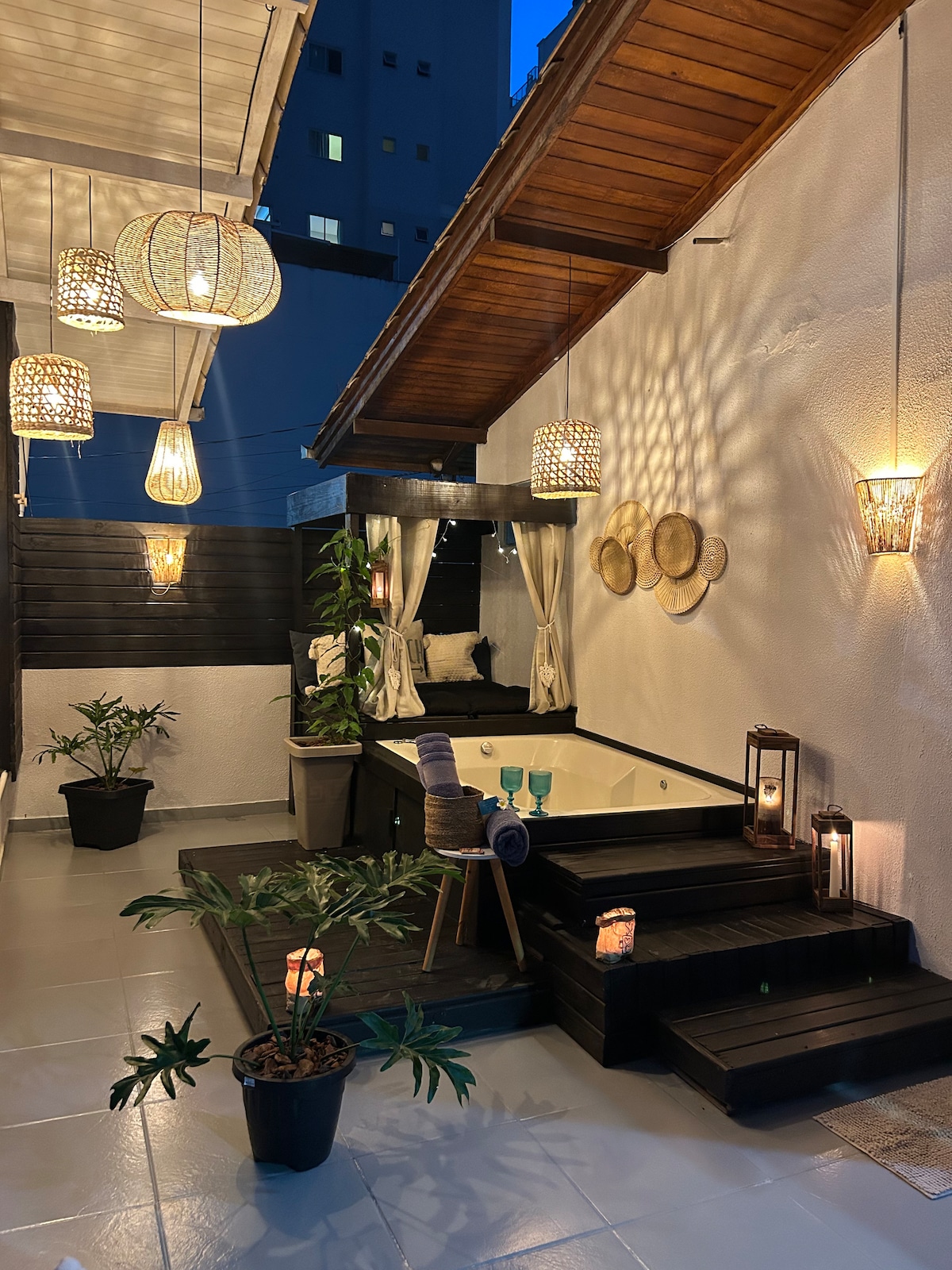 Aqui, cada detalhe foi criado para proporcionar conforto, privacidade e uma atmosfera romântica irresistível. A área externa é o grande destaque: iluminação aconchegante, decoração charmosa e uma hidromassagem acolhedora com bangalô e velas — o cenário ideal para um momento inesquecível.