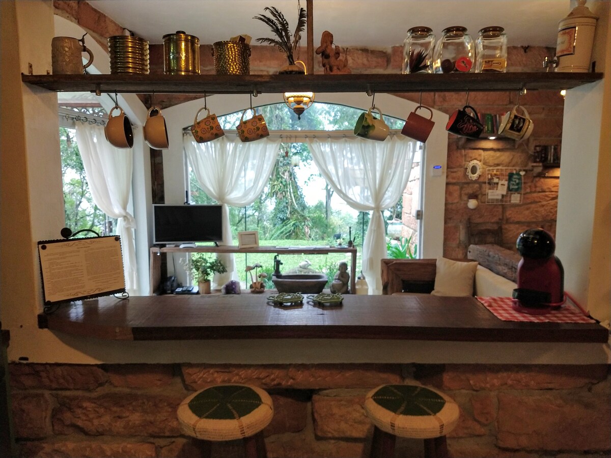 A casa fica a aproximadamente 2,5km (4min de carro) do centro de Canela. O espaço é maravilhoso por causa do ambiente rústico e aconchegante e por causa da área externa, que tem uma natureza exuberante e vista para o vale. É ideal para casais. A casa possui 01 dormitório com cama de casal, sala de estar com sofá/cama para duas pessoas e lareira ecológica, cozinha completa com fogão campeiro, sala de jantar e banheiro. Não fornecemos lenha para o fogão campeiro ou fogo de chão e nem etanol.