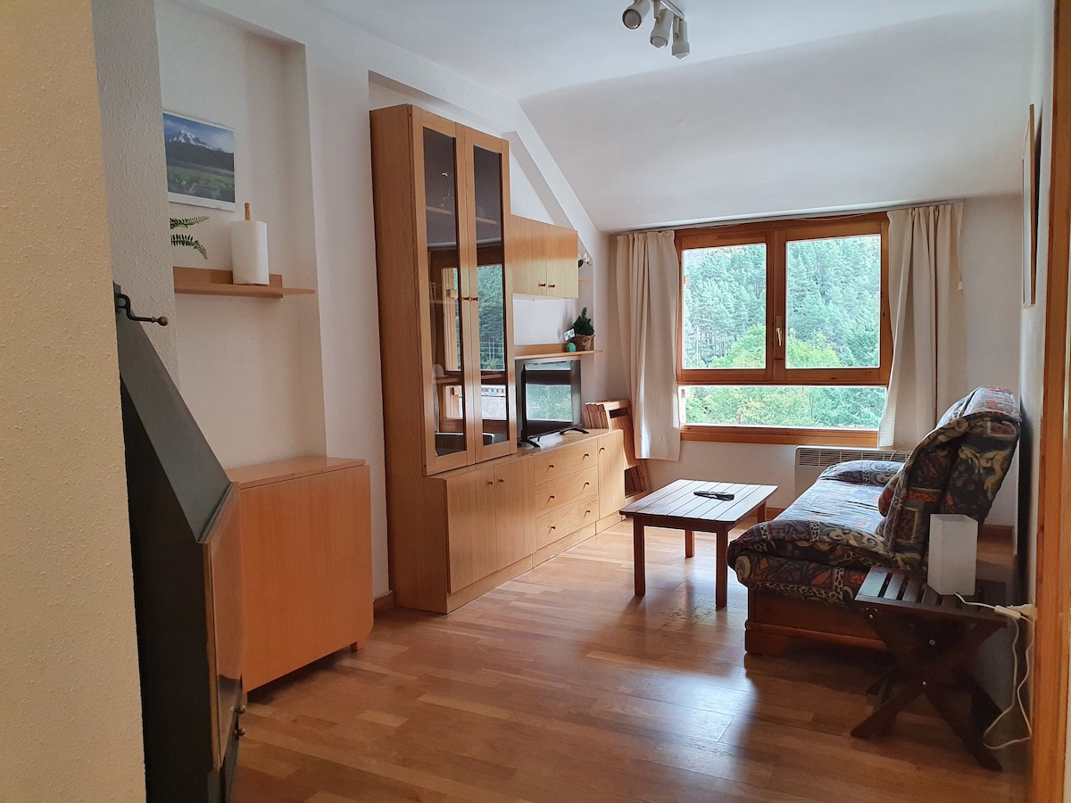 Apartamento localizado no meio da montanha de Canfranc Estación, muito acolhedor e com uma vista maravilhosa. Consiste em um quarto com cama de casal, sala de estar com sofá-cama, cozinha e banheiro. Tem aquecedores no quarto e no banheiro e um fogão a pellets na sala de estar. Equipado com tudo o que você precisa para tornar a sua estadia o mais agradável possível (roupa de cama, berço, toalhas, secador de cabelo, utensílios de cozinha, cafeteira, torradeira, micro-ondas, jogos...). O condomínio tem uma piscina e uma área de jogos.