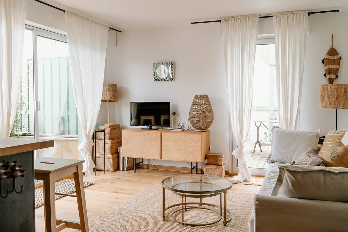 Localizado em uma das mais belas praias da Baía de Arcachon, no coração do muito popular Moulleau, este apartamento está totalmente virado para o mar. Totalmente concebido e decorado pelo escritório de arquitetura OUD, ele inclui uma sala de estar luminosa com vista para a praia e para o farol do Cap Ferret, uma varanda, um quarto, um banheiro e uma cozinha totalmente equipada. É um lugar para descansar, meditar, contemplar, tomar banho, inspirar-se e sonhar.