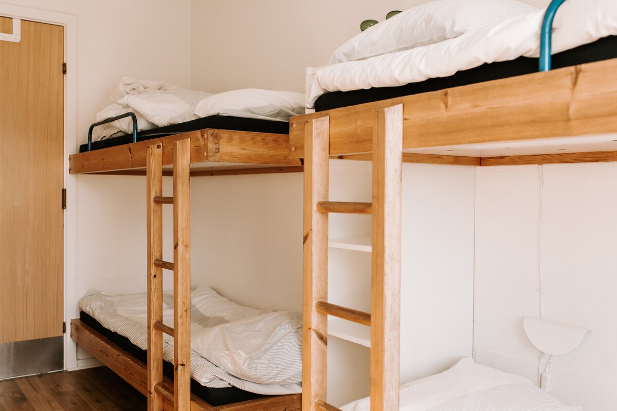 Este encantador quarto de três camas é a escolha ideal para pequenos grupos, amigos ou famílias com crianças mais velhas, que procuram uma base descontraída num cenário deslumbrante. O quarto está mobilado com um beliche, uma cama de solteiro e uma área de estar acolhedora com uma mesa e uma cadeira – perfeita para um jogo rápido, uma chávena de café ou para planear as aventuras do dia. Por favor, note que o quarto não é adequado para uma cama de fim de semana, mas é perfeito para três pessoas que procuram uma estadia simples e tranquila numa atmosfera acolhedora.