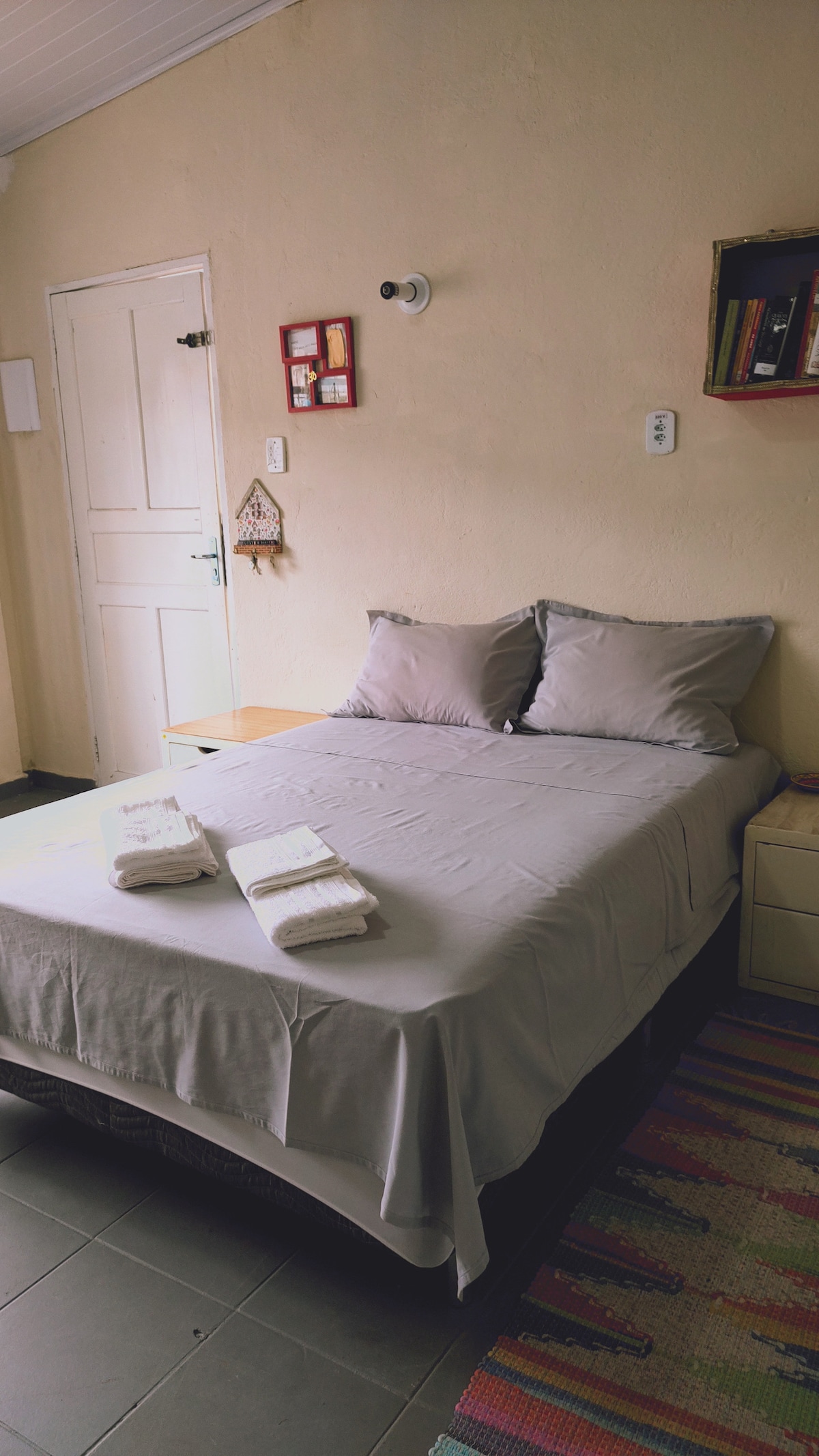 Nossa propriedade é um sítio rodeado de natureza, onde está localizado nossa moradia. Para atender a amigos, e hóspedes construímos uma suíte privada. Temos vista privilegiada para o mar Acomoda 2 pessoas, eventualmente uma terceira pessoa no colchão avulso. Temos TV, geladeira e micro-ondas, ventilador de teto e ar condicionado. Estamos a 300 m da praia da Ilha das Cabras. Não permitimos som alto, churrasqueiras Referente ao check-in e ao check-out podemos ajustar