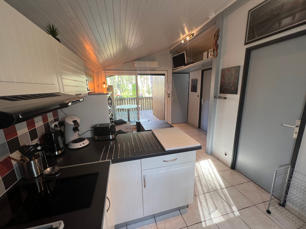 Chalé de 40 m², bem iluminado, totalmente equipado e climatizado, com Wi-Fi. - Dois quartos - Cozinha aberta para a sala de estar (lava-louças, micro-ondas, cafeteira Senseo, chaleira, forno, geladeira, torradeira, placa de indução). - Banheiro com banheira de relaxamento e vaso sanitário. Ao ar livre, você desfrutará de um jardim privado de 250 m², spa, terraço de 50 m² sem vizinhos e com uma área de churrasco. Estacionamento para um veículo. Roupa de cama e toalhas fornecidas.