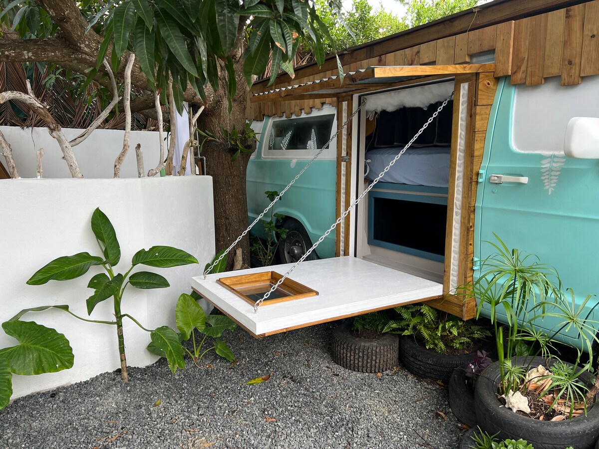 Bem-vindo ao VAN ABANDONADO, o seu refúgio escondido sob uma mangueira. 2 minutos a pé da praia 35 min - Aeroporto SJU 25 min - El Yunque 25 min - Piñones 20 min - Los Kiosks de Luquillo Esta carrinha convertida oferece uma cama queen-size acolhedora, ar condicionado e amplo espaço ao ar livre. Relaxe no deck elevado, balance-se em cadeiras de corda e delicie-se com o chuveiro ao ar livre. Experimente o paraíso do glamping no abraço da natureza.