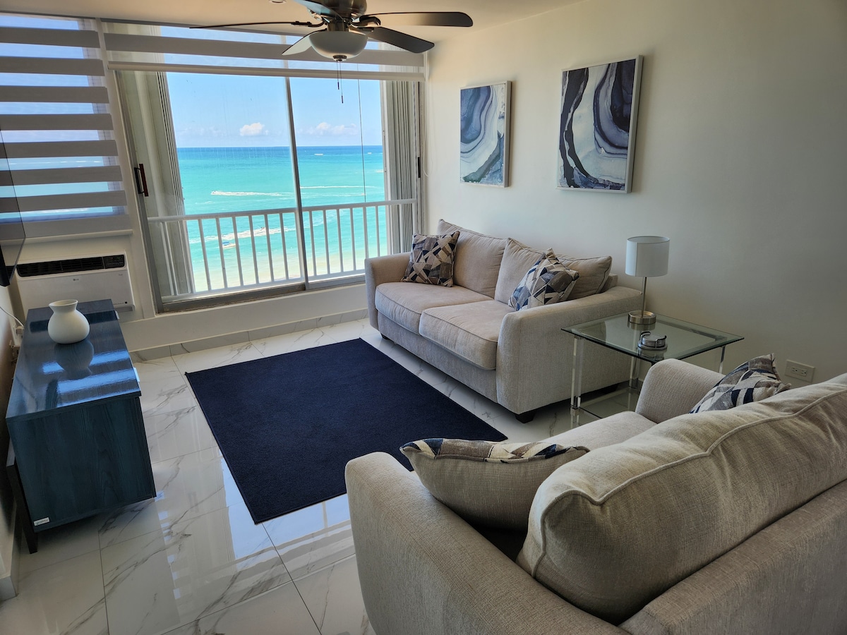 Muitos anfitriões afirmam que sua visão é a melhor, mas a nossa realmente é, como as avaliações atestarão. Este é um grande estúdio no último andar de um condomínio de 12 andares, localizado na areia, com uma vista verdadeiramente deslumbrante da melhor praia de San Juan (classificada como a melhor praia urbana do mundo pela USA Today), janelas do chão ao teto, estacionamento reservado, unidade de ar condicionado split, Wi-Fi e TV Roku, em um edifício seguro com elevadores operados por chave. (Para check-in/check-out fora do horário, desça até "POLÍTICAS")