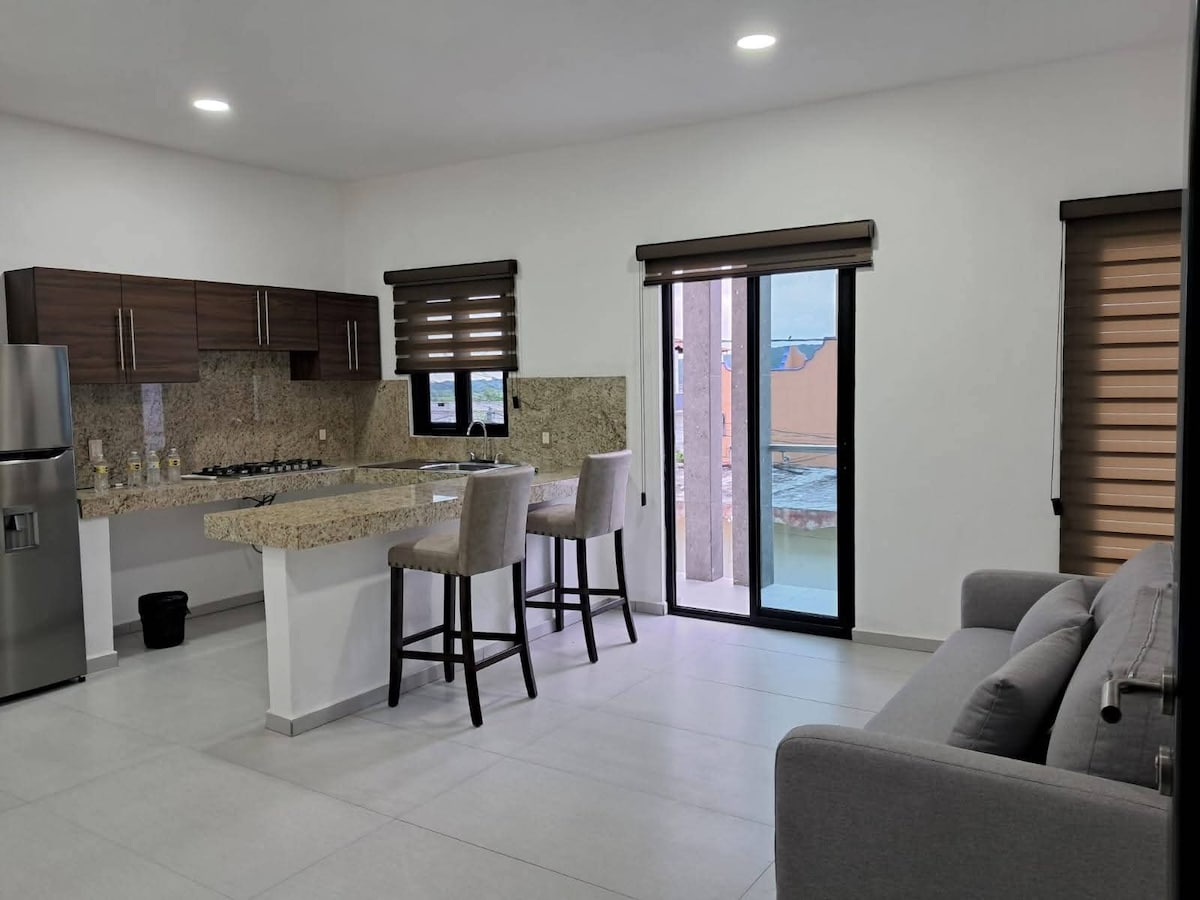 Apartamento novo com excelente localização, preferencial para 2 pessoas. Tem ar condicionado no quarto e TV com Chromecast para que possa desfrutar dos seus filmes da Netflix, além de cozinha equipada e TV de 43 polegadas no quarto com Netflix incluída. A avenida principal está localizada a 3 quarteirões e meio de distância, a praia fica a 2 quarteirões de distância. O bairro é tranquilo e amigável, você vai encontrar mercearias, um pequeno supermercado, açougue e loja de tortilhas.
