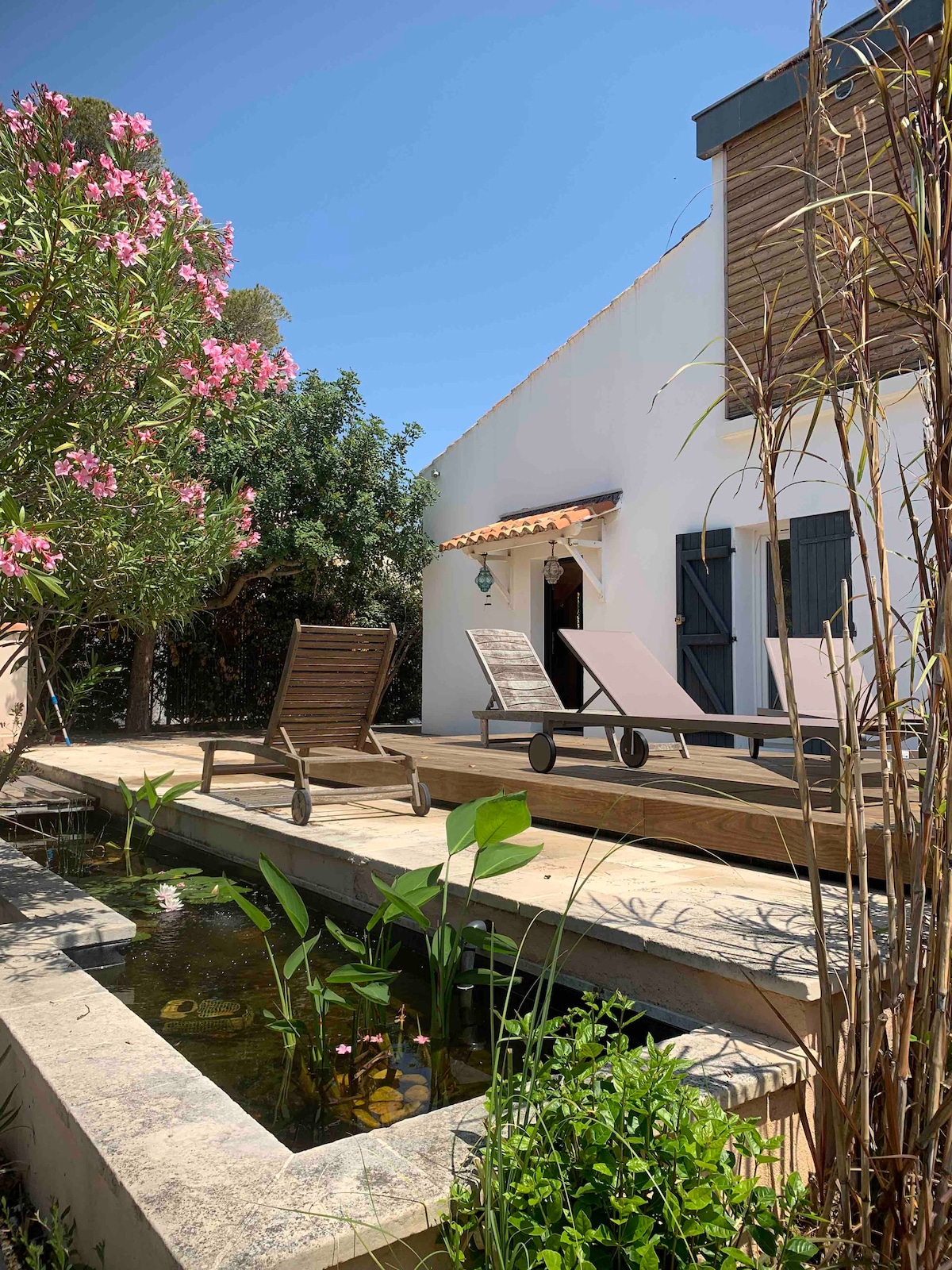 A casa (60 m²) de um só andar, localizada em um beco sem saída, com uma vista desobstruída para a lagoa de Berre, é adequada para um casal com 2 filhos ou 3 adultos. 2 terraços onde você pode se sentar para o café da manhã ou refeições: um na entrada da casa, o outro na parte de trás. Seu carro será estacionado dentro do jardim fechado por um portão. Nós moramos na casa ao lado, mas garantimos a nossa discrição.