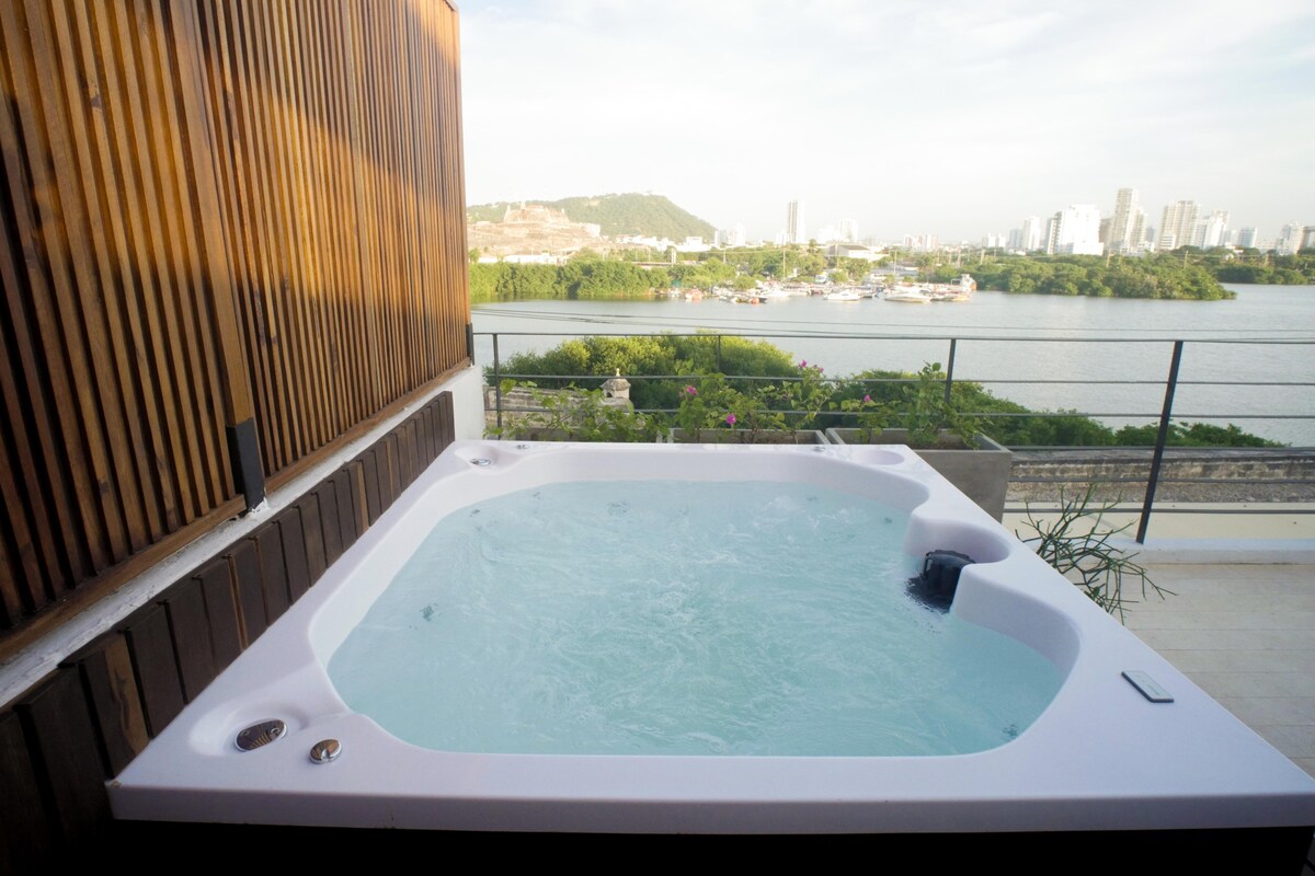 Este novo apartamento elegante está localizado no bairro histórico de Getsêmani, dentro da antiga cidade murada. Da jacuzzi em seu terraço/terraço privativo, você pode desfrutar de uma vista magnífica da baía, do Castillo San Felipe e do horizonte de Manga. Fica a uma curta caminhada dos melhores pontos turísticos do centro da cidade: restaurantes, bares, praças. Perfeito para casais ou pequenos grupos de no máximo 5 pessoas.