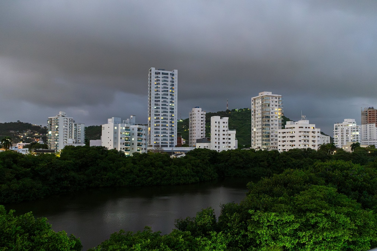 Apartamento exclusivo no 30º andar Morros City com vistas incríveis e cativantes para o mar e para o centro histórico. Quarto principal com vista direta para o mar e acesso à varanda. Cozinha completa, máquina de lavar e secar roupa 2 em 1, Smart TV de 60", Wi-Fi de 500 MB de fibra óptica. Bocagrande à beira-mar com comodidades de luxo: piscina, jacuzzi, banho turco e ginásio. Estacionamento gratuito. Ideal para casais que procuram a experiência mais exclusiva do piso mais alto disponível em toda a Cartagena.
