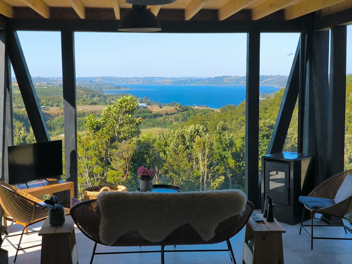 Escápate a este refugio autosustentable en Achao diseñado por Edward Rojas. Vistas al mar desde cada rincón y Hot Tub privado para el descanso total. Tu día aquí: remar en SUP, leer junto a la estufa a pellet, ver cine en el proyector o tocar guitarra junto a un fogón sin humo. Con WiFi, pequeño escritorio y fácil acceso: a 5 min del pueblo y 40 min del aeropuerto. Un entorno de paz, a 5 min caminando a la playa! Ideal para 2-3 personas que buscan volver su equilibrio en este entorno mágico.