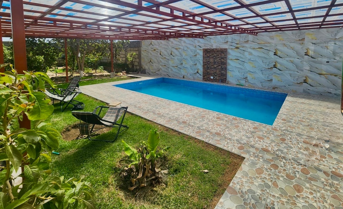 Casa de campo de 1000m2: casa del árbol, piscina temperada TECHADA con luces nocturnas, zona parrillas, equipo de sonido, mesa amplia, horno al aire libre, parlante, salón de juegos (billar, fulbito), huerto frutal, vista a volcanes, 4 dormitorios / 7 camas cómodas, WiFi, TV y garaje interno para varios carros.Pet-Friendly. Total privacidad. 1000 m² totalmente cercados, entorno natural y relajante, perfecto para familias, niños, mascotas o grupos de amigos que quieran relajarse y divertirse
