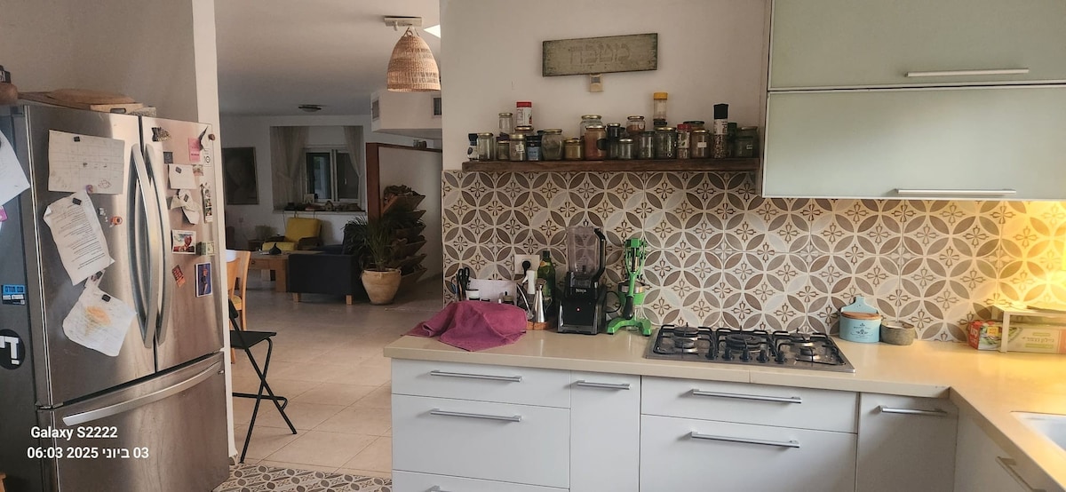 Fique na minha luxuosa casa de 3 quartos numa aldeia tranquila no centro de Israel, com um teto de 6 metros de altura e uma mistura única de arte pop de luxo e decoração vintage. Desfrute de vistas para o nascer do sol a partir do quarto principal e do pôr do sol a partir do terraço panorâmico com jacuzzi e chuveiro ao ar livre. Inclui uma cozinha totalmente equipada, quarto para crianças com beliches, quarto seguro (mamad) com áreas de trabalho e lazer, Wi-Fi rápido, Netflix, máquina de lavar e secar roupa. Perfeito para quem procura conforto e estilo!
