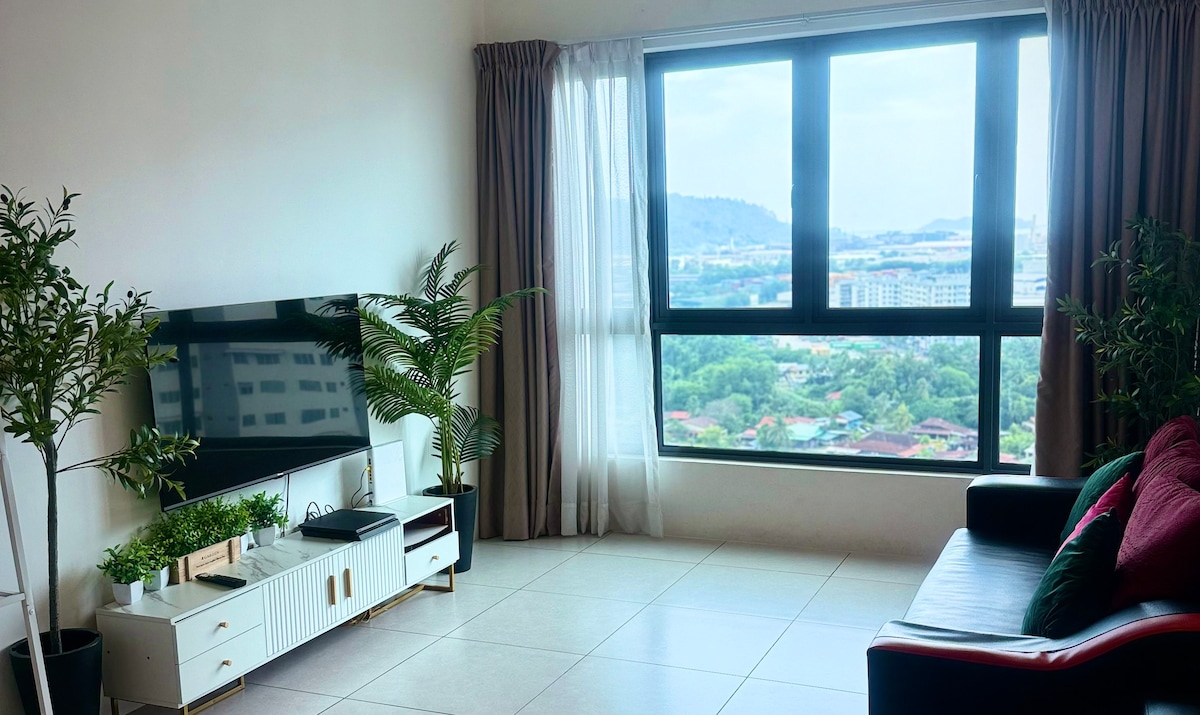 Apartamento de 3 quartos recém-construído em andar alto com 2 banheiros localizado no coração de Bukit Mertajam, Penang. Estrategicamente situado a 10 minutos de carro da ponte Penang, Icon City, Sunway Carnival Mall e Sunway Medical Centre Penang e a 5 minutos do KPJ. Wi-Fi de alta velocidade. Temos TV com o melhor receptor para que você possa relaxar após um longo dia de passeio. Qualidade e acessível honestamente Casa aconchegante Nosso lugar é altamente recomendado para pequenos grupos de família e amigos. Acomoda perfeitamente até 7 hóspedes